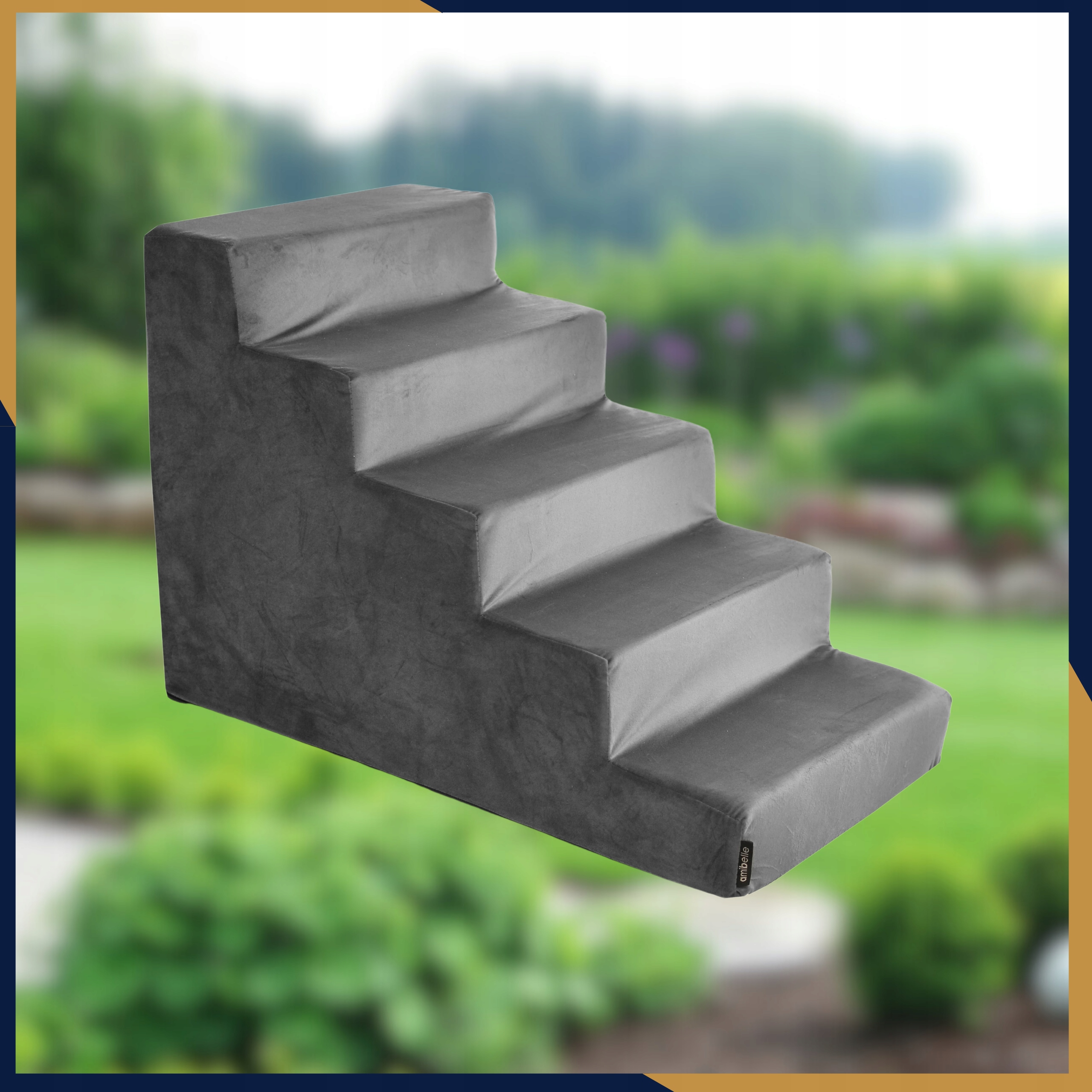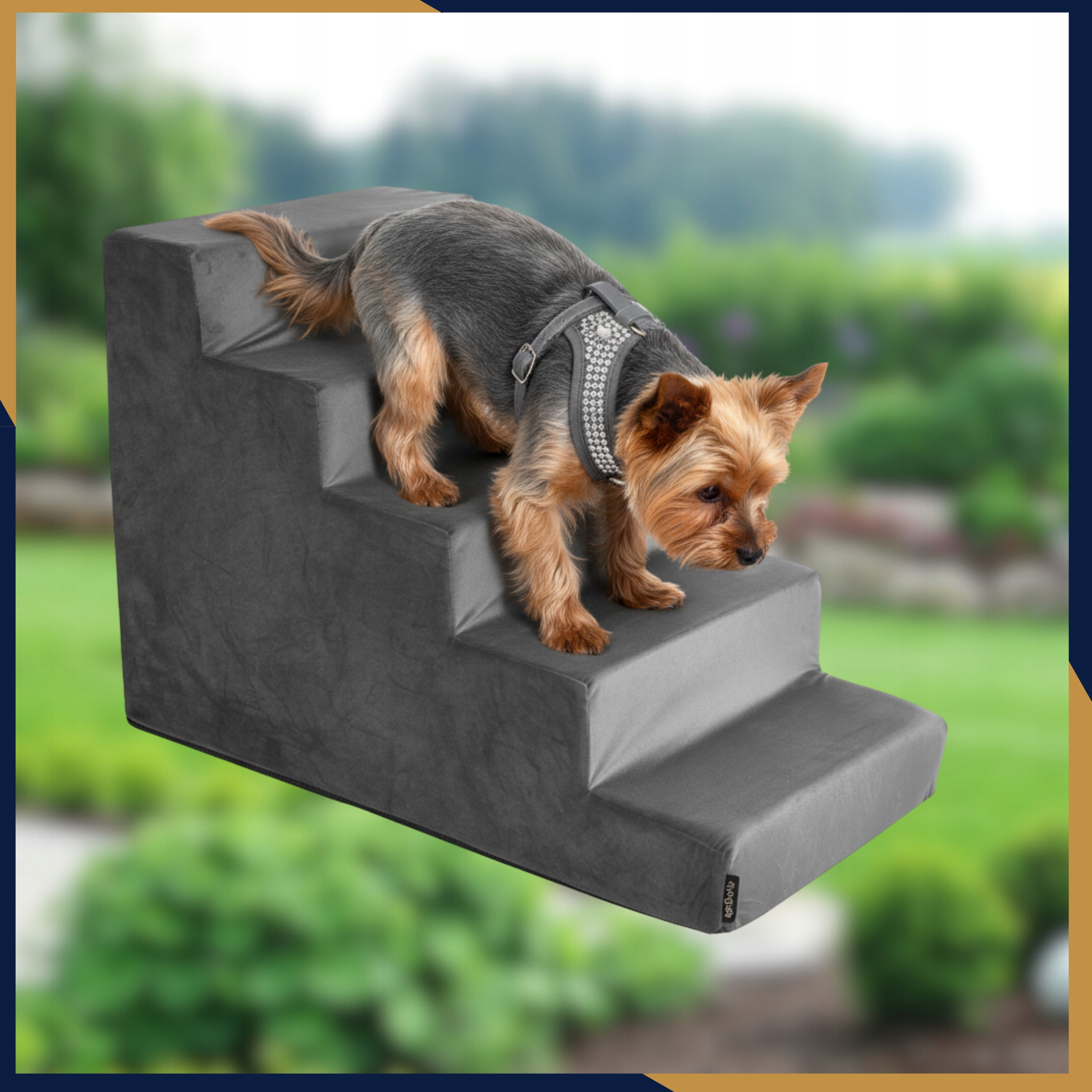 Schody Amibelle Velvet 5 w modnym szarym kolorze to niezawodne wsparcie ortopedyczne dla Twojego pupila. Są niezbędne dla zwierząt starszych, z problemami stawowymi lub po prostu małych ras, które potrzebują bezpiecznego dostępu do wyższych powierzchni. 5-stopniowy podest o wysokości 50 cm umożliwia psu lub kotu bezpieczne i bezbolesne wchodzenie na kanapę czy łóżko.