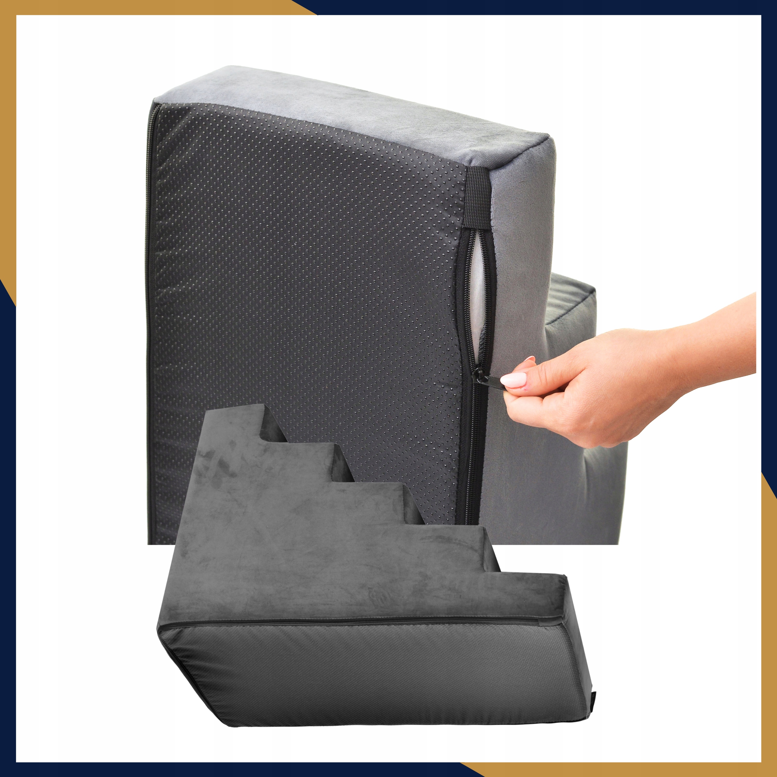 Pomimo niskiej wagi 2,6 kg, schody są wyjątkowo stabilne i nie przesuwają się po podłodze – to dzięki połączeniu sztywnej pianki tapicerskiej i antypoślizgowego spodu z silikonowymi kuleczkami. Pokrycie z miękkiego materiału Velvet jest zdejmowane i idealnie nadaje się do prania w pralce, co gwarantuje długotrwałą czystość. Uwaga: Schody przeznaczone są wyłącznie do użytku domowego, nie nadają się do samochodu.